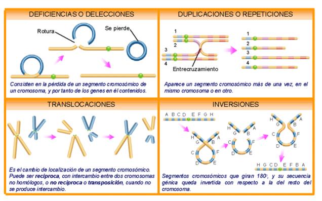 Se reconocen varios tipos de mutaciones. La mas común es la llamada “mutación puntiforme” causada por un cambio dentro del gene a nivel molecular, en contraste con las mutaciones que resultan de una pérdida o delección (deficiencia) de una porción de un cromosoma. La mayoría de las mutaciones espontáneas son mutaciones puntiformes. Estas mutaciones a menudo son reversibles en el sentido de que el gen puede mutar en retroceso, o se, regresar a su condición original mientras que las mutaciones por delección o deficiencia no pueden invertirse. Las mutaciones también pueden originarse por transferencia y re adhesión de un segmento cromosómico a otro cromosoma, fenómeno conocido como translocación cromosómica. La situación particular en la que un cromosoma se rompe en dos o más segmentos, se reconstituye, pero en orden diferente se le llama inversión y ocasiona también mutaciones. La frecuencia de delecciones, translocaciones, e inversiones puede ser aumentada considerablemente aún mas por radiaciones ionizantes tales como los rayos X. dos puntos finales deben tratarse: Primero, la gran mayoría de las mutaciones son en general perjudiciales, originando ciertos defectos en la estructura o funcionamiento del organismo. Y segundo, aunque podemos aumentar la frecuencia de las mutaciones, por medio de la exposición a agentes mutagénicos, éstos son sucesos aún fuera de nuestro control en el sentido que no podemos dirigir la formación de un cambio específico hereditario que deseemos para corregir el cambio.
